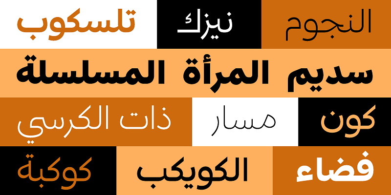Proxima Nova Arabic (2024) was designed by Khajag Apelian and Wael Morcos to complement Mark Simonson’s ever-popular Proxima Nova. Using a sculptural approach, a balance was reached between the calligraphic and geometric, giving graphic designers and typographers an Arabic script with the look and utility of a modern sans serif excellent for print and screen use. Available in eight weights — from Thin to Black — this growing family of typefaces is set to become even more popular worldwide.
