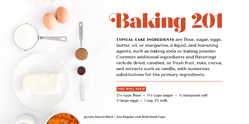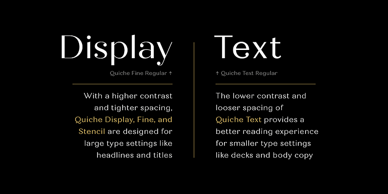 Quiche Text is a high-contrast, sans serif typeface featuring ball terminals and angled stems. Influenced by the serif didone genre, it removes the serifs for a unique and modern expression.