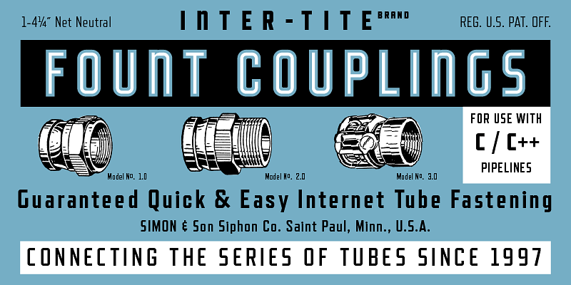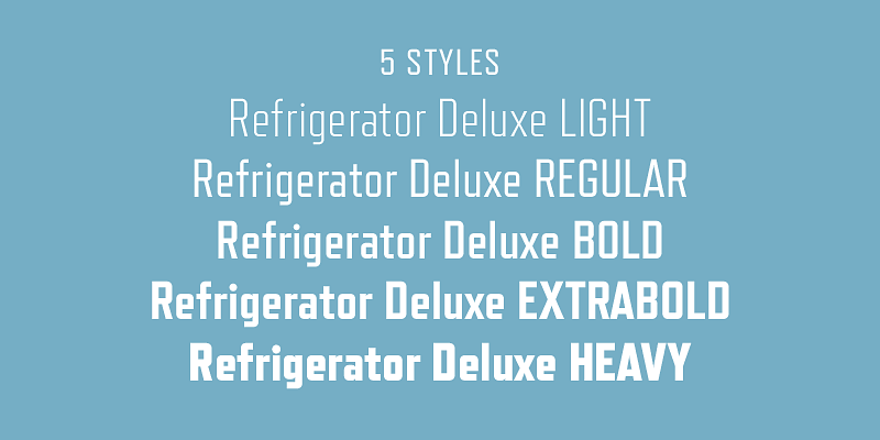 Refrigerator Deluxe (2008) was inspired by generic block-style lettering typical of the mid-20th century. It follows the typical American model that can be seen in old lettering manuals, although I designed it purely from memory. I originally released it in 2000 as Refrigerator, with just the Bold weight. In 2003, I added Light and Heavy. Refrigerator Deluxe adds a new weight (Regular) and loads of alternate characters that can be used to create common variations of the block letter style on which it is based.