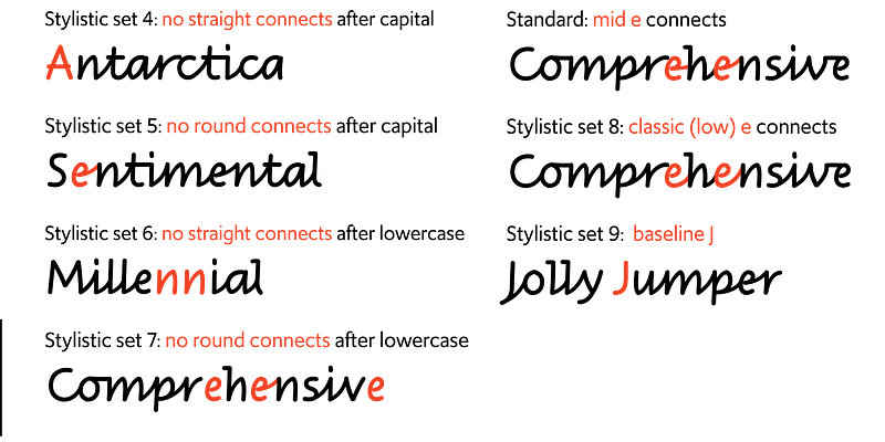 Fonts in the Adobe Fonts library include support for many different languages, OpenType features, and typographic styles.
