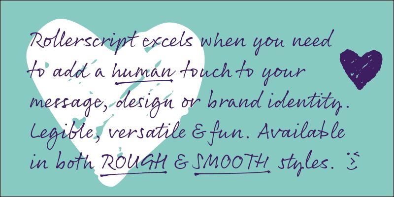 Rollerscript excels when you need to add a human touch to your message, design or brand identity. A casual, informal handwriting font created with a roller pen it is legible, authentic, versatile and fun.