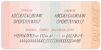 Salt House is a hand-drawn ALL CAPS font. It’s simple nature stands well alone or as a foil to more expressive scripts. Salt House was designed to compliment modern calligraphy fonts and is solid match for illustrations.