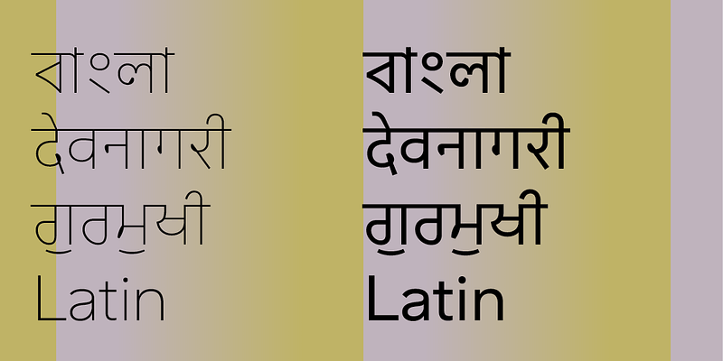Sarvatrik offers a robust set of weights as well as language support across Bangla, Devanagari, Gurmukhi and Latin - with more Indic scripts set to follow. It’s a practical choice, performing well at both large and small sizes but without compromising on its friendly, open personality. The Latin version works seamlessly alongside Bangla, Devanagari and Gurmukhi, making it a good choice for multi-language branding, or companies working in several markets.