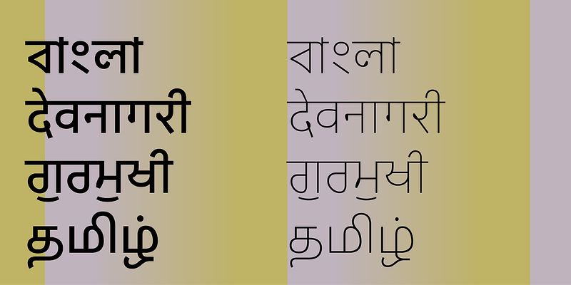 Sarvatrik offers a robust set of weights as well as language support across Bangla, Devanagari, Gurmukhi, Tamil and Latin - with more Indic scripts set to follow. It’s a practical choice, performing well at both large and small sizes but without compromising on its friendly, open personality. The Latin version works seamlessly alongside Bangla, Devanagari and Gurmukhi, making it a good choice for multi-language branding, or companies working in several markets.