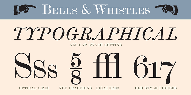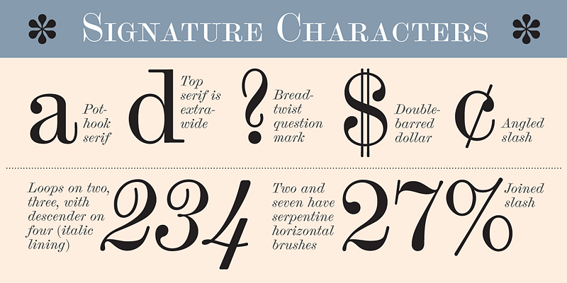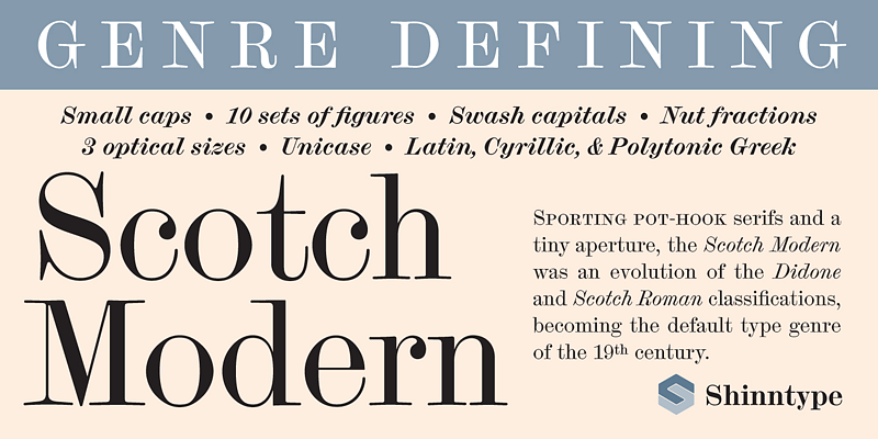Recontextualizing the 10-point type of a scientific report published in 1873, Shinn has produced sleekly refined, micro-detailed vector drawings by eye, without the usual reliance upon scans and tracing—the result is uniquely authentic. With optical sizes, copious OpenType features and extensive language coverage, this Scotch is quite magnificent.