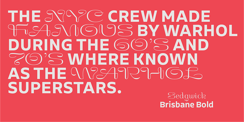 Sedgwick’s forms were inspired by the structure and stroke of Nieuw Javaansch No.1, Troy’s unreleased revival 2012, of Lettergieterij Amsterdam’s 1909 typeface, and the unique form and texture of the civilité types of the 15th and 16th centuries. The name ‘Sedgwick’ is inspired by Warhol’s muse—Edie Sedgwick—the factory girl with timeless charm and charisma.