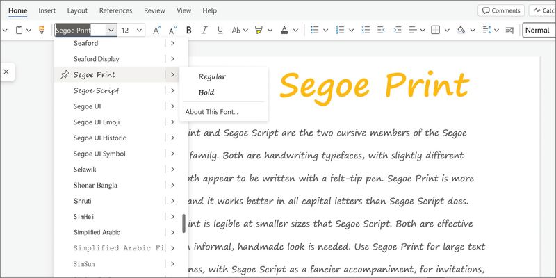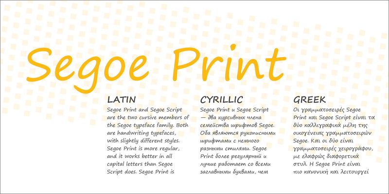 Segoe Print and Segoe Script are the two cursive members of the Segoe typeface family. Both are handwriting typefaces, with slightly different styles. Both appear to be written with a felt-tip pen. Segoe Print is more regular, and it works better in all capital letters than Segoe Script does. Segoe Print is legible at smaller sizes that Segoe Script. Both are effective where an informal, handmade look is needed. Use Segoe Print for large text or headlines, with Segoe Script as a fancier accompaniment, for invitations, labels, flyers, brochures, or packaging.