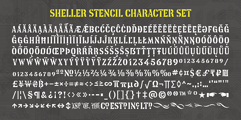 Designed by Jesse R. Ewing. Sheller Stencil is a font family from Midwest Type—a member of The Type Founders collection. For additional license options like app, enterprise, multi-user, and self-hosted web, visit Midwest Type.