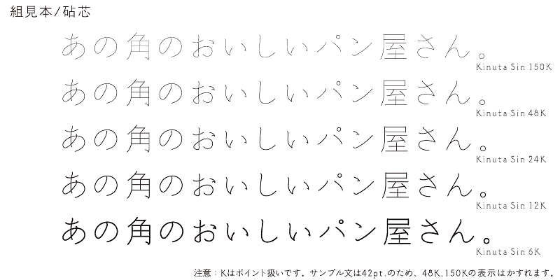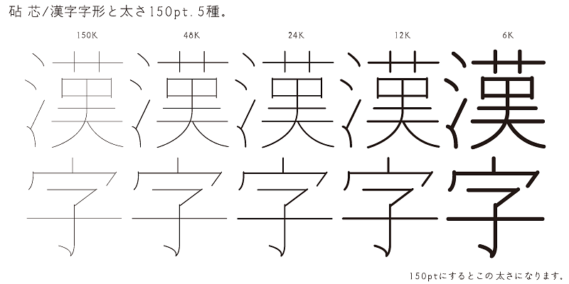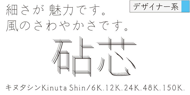 This typeface is characterized by the thinness of its strokes. Each weight name indicates the smallest type size at which the font can be displayed. Its adaptive design complements photographs and illustrations. One of the unique qualities of Shin is that even if you overlap multiple instances of a character, the result is still legible. It’s an elegant design with a flavor of the Mincho-style.