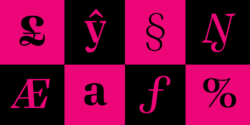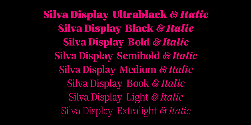 Designed primarily for editorial use, Silva is a superfamily ideal to typographically complex environments requiring a highly versatile typeface. With slightly condensed proportions, generous x-height, moderated ascenders and descenders and robust serifs, it is an extremely readable and economic type. Subdivided in two optical sizes, the family has a total of 26 fonts including italics. Silva has an extensive character set — with extensive language support — that provides both old style and lining figures as well as their respective tabular versions, fractions, various ligatures, small capitals, arrows and a number of different symbols.