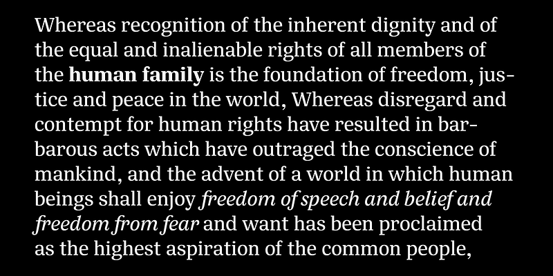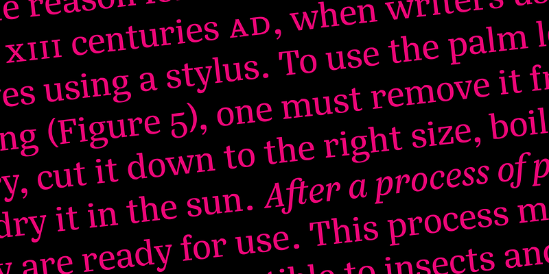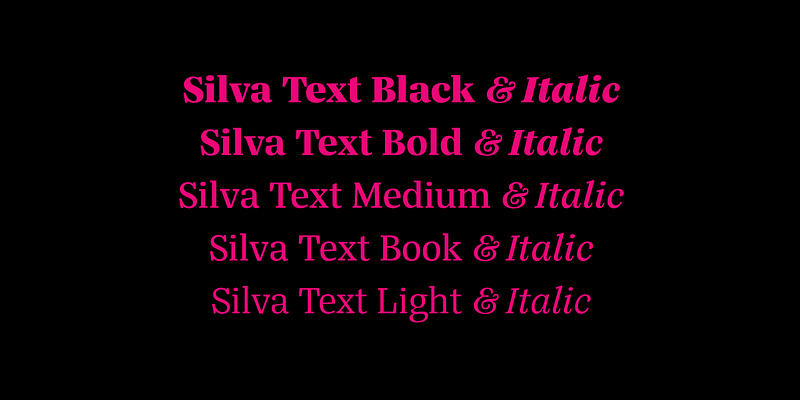 Designed primarily for editorial use, Silva is a superfamily ideal to typographically complex environments requiring a highly versatile typeface. With slightly condensed proportions, generous x-height, moderated ascenders and descenders and robust serifs, it is an extremely readable and economic type. Subdivided in two optical sizes, the family has a total of 26 fonts including italics. Silva has an extensive character set — with extensive language support — that provides both old style and lining figures as well as their respective tabular versions, fractions, various ligatures, small capitals, arrows and a number of different symbols.