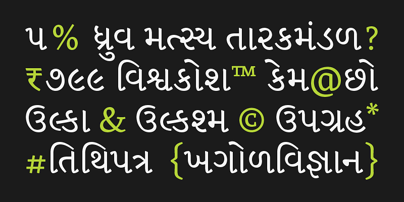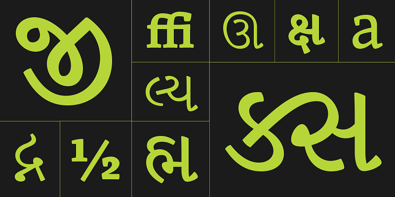 Skolar Gujarati is a hardy text typeface built to attend to the rigors of academic and scholarly typography. It provides Skolar’s serious typesetting capability with a hint of individual style, but devised for the needs of Gujarati typesetting.