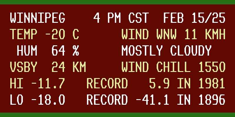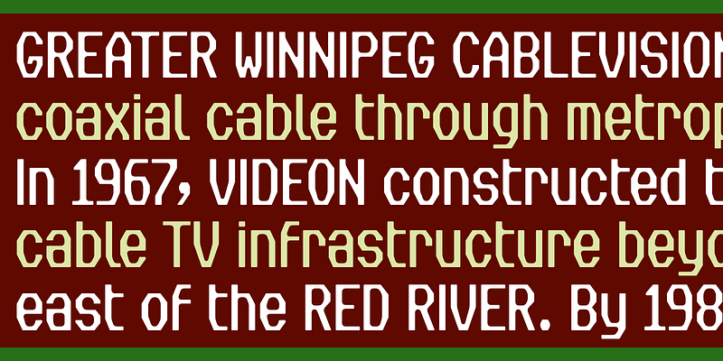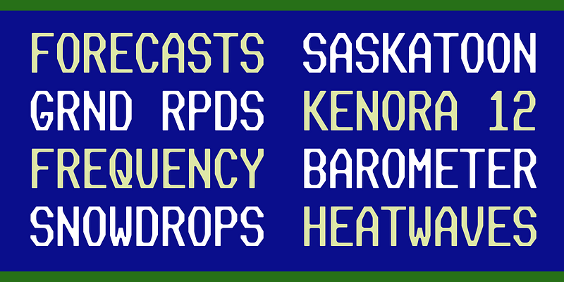 Matt Hadden and Mark J. Szymanski maintain a simulator of Environment Canada Weather Channel as it appeared on Greater Winnipeg Cablevision in the 1990s, livestreaming current weather. I worked with them to revive the angular bitmap font in use at the time, and then undertook this freer interpretation with both proportional and monospaced versions and an accompanying lowercase. Slight Chance evokes the worn, slightly-degraded texture of letterforms that have endured cable transmissions and cathode ray tubes, contrasting gummy, amorphous interior shapes with a harder-edged, octagonal exterior.