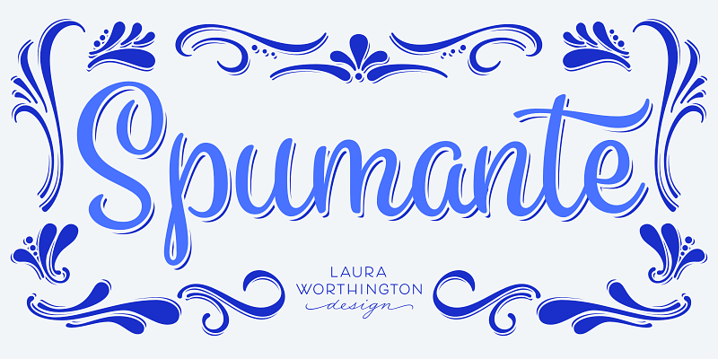 A slim, semi-connected script with lithely upright curves, Spumante is ideal for food packaging and menus, cosmetic labels, book covers, or greeting cards and invitations. Dress it up with over 200 swashes, alternates, and ornaments, or use the titling alternates for a minimalist, unconnected look.