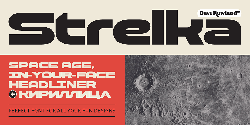 Strelka Ultra is a space-age headliner, perfect for your interplanetary tourism business, spaceport wayfinding systems, or sentient robot army’s corporate identity. For that authentic galactic look, a Cyrillic alphabet was a must. Small Caps and a handful of useful alternates are included for Latin glyphs. Lastly, automatic fractions are available for all your (g)astronomic cookbook needs.