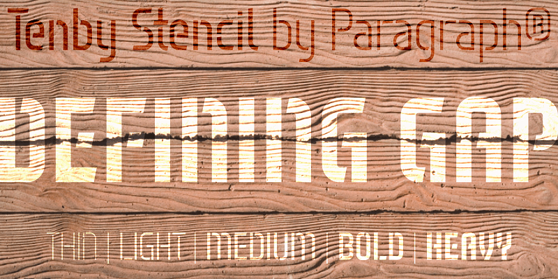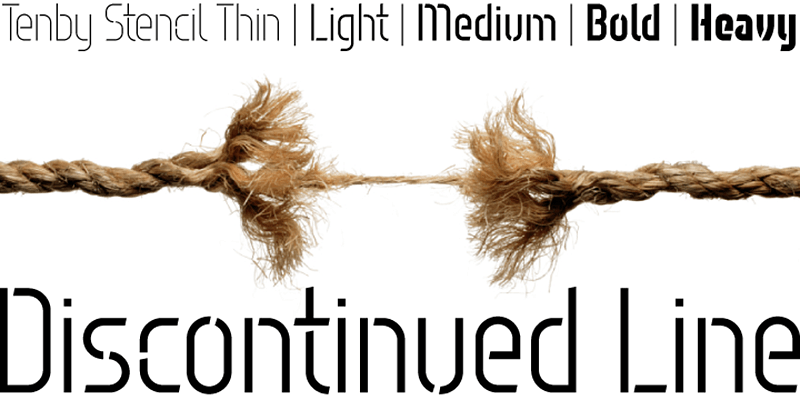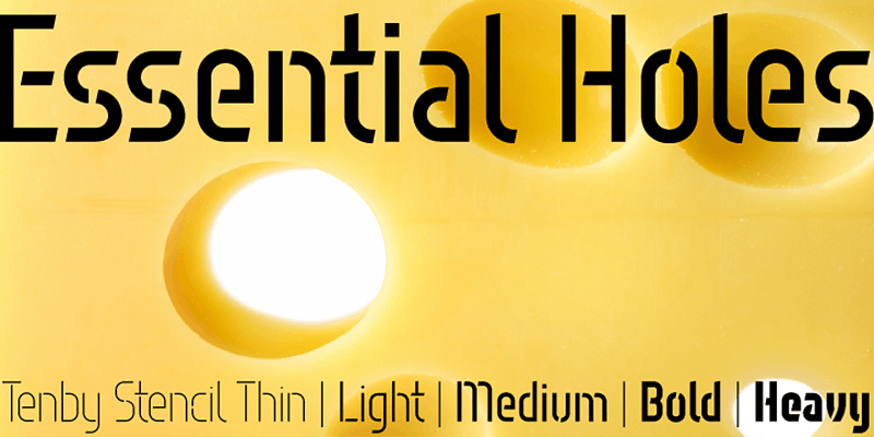 Tenby is a series of modular geometric display sans serif fonts with a hint of Art Deco combined with a 1980s finish. The fonts’ underlying grid is ten squares high. Their widths correspond to condensed (Tenby Four), normal (Tenby Five) semi-extended (Tenby Six), extended (Tenby Seven), and extra-extended (Tenby Eight). Each contains two weights, light and regular. Although smaller text sizes are still quite legible, the fonts work better at large sizes. Tenby Stencil’s gaps are purely decorative. They have a consistent size and angular similarity, giving headlines or logos a unique dramatic effect.