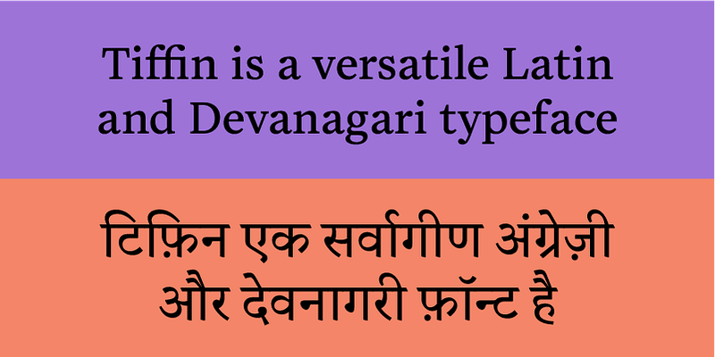 Tiffin is a versatile Latin and Devanagari typeface that can be used to set the scripts individually or together. It has a classic feel, thanks to its ties with modern old style cuts designed in Scotland and India in the late 19th century and early 20th century.