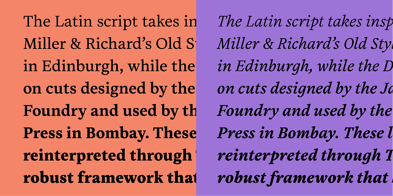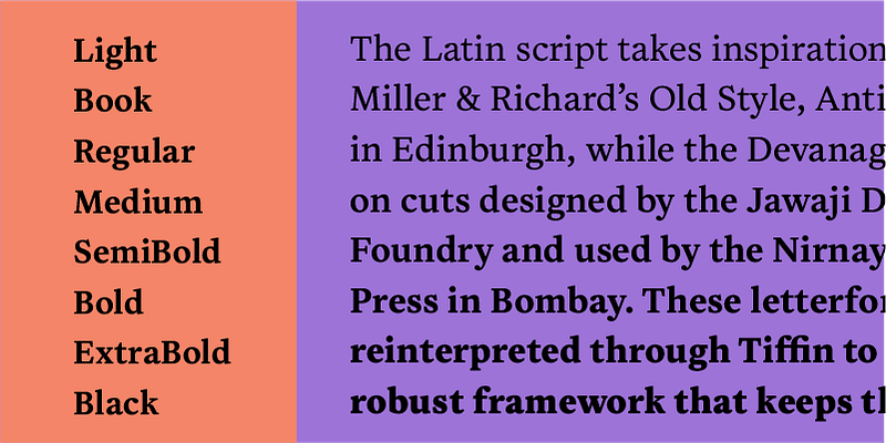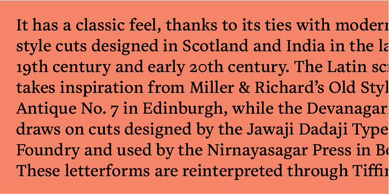 Tiffin is a versatile Latin and Devanagari typeface that can be used to set the scripts individually or together. It has a classic feel, thanks to its ties with modern old style cuts designed in Scotland and India in the late 19th century and early 20th century.