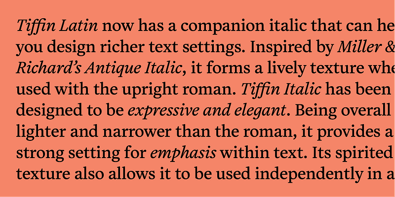 There’s a thoughtfulness and sincerity to Tiffin but it comes with an underlying sense of playfulness, allowing it to flex across different themes, genres and formats. Use it to typeset a Nobel Prize-winning novel, or draft a manifesto for a utopian future.