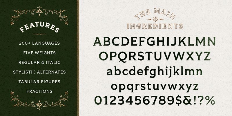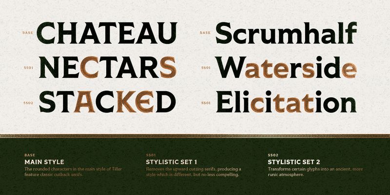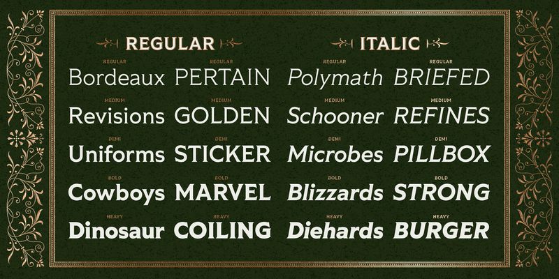 Inspired by geometric shapes, Romanesque typography, and an undying love for 19th century ephemera, Tiller balances its forms with flare and function. Taking a step away from Shackleton’s more ornate tendencies, this family takes a more workhorse approach with 5 weights from Regular to Heavy with both Roman and Italic styles. Tiller speaks more than 200 languages and is packed full of features like stylistic alternates, case sensitive punctuation, and more.