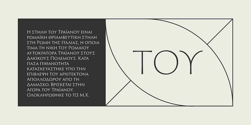 Trajan Sans is a sans serif companion to Carol Twombly’s popular Trajan typeface, first released in 1989. It is a fresh interpretation by designer Robert Slimbach, a complement to his extension of the Trajan Pro family. Like Trajan Pro, Trajan Sans is an all-caps typeface (it has no lowercase), derived from the famous inscription at the base of Trajan’s column in Rome. Slimbach set out to create “a distinctly modern sans-serif display type family that retains the elegance and versatility of the original Trajan family.”