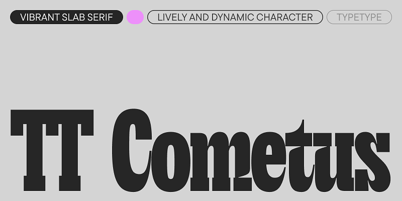 TT Cometus is a modern slab serif. The typeface’s name evokes the image of a comet—a powerful and weighty celestial body with a beautiful tail slicing through space at an incredible speed. This is the key to understanding this font. The font embodies a balanced personality: impressive and sturdy but energetic and dynamic at the same time.