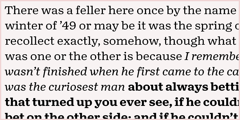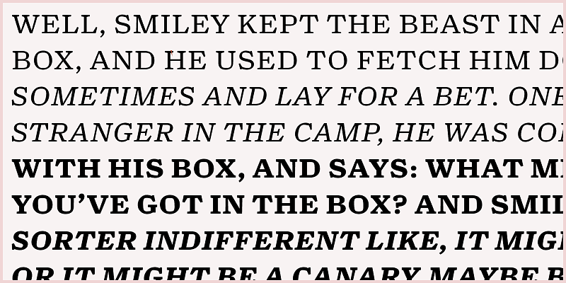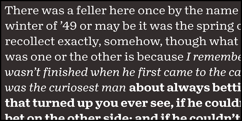 Where classic serif faces are urbane and well-mannered, Turnip is coarse and down-to-earth – the kind of type that feels completely at home with salty language. David Jonathan Ross crafted an energetic tension between Turnip’s inner and outer shapes to give it vigor, while strong strokes and sturdy serifs yield dense paragraphs with a horizontal emphasis. This ain’t your grandpa’s book face, but it reads just as well.