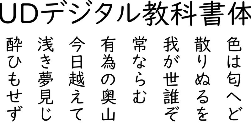 UD Digital Kyokasho is a universal design typeface for ICT-based educational materials, such as digital textbooks. It is designed to emulate handwriting with a pencil or felt pen, focusing on hand movement. While keeping the direction of the axis and the shape of dots and the harai (sweep) ending, its strokes have less contrast, conscious of the people with low vision and dyslexia. The structure is more close to the penmanship style for textbooks instead of the conventional educational letterforms based on the national guidelines.