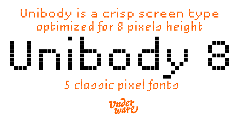 Unibody is a crisp screen type, reminiscent of classic pixel fonts from the early digital era. This family, with a true italic, is designed for 8 pixels height, now adapted to current technologies.