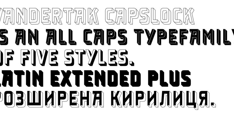 As its name suggests, Vandertak CAPSLOCK Line is an all-caps version of Vandertak. But it is also much more than that. Referencing the architectural origins of the typeface, the five styles were given a dimensional look. Because they are stackable, you can overlay variants in different colours to create chromatic typography. Let your titles and headlines pop up from the page – almost literally – with colourful combinations of Vandertak CAPSLOCK Line.