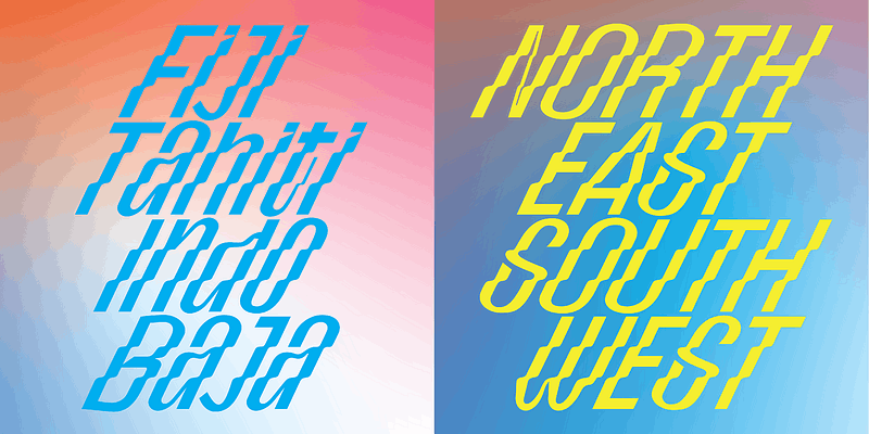 Velzyland, by CJ Dunn, is an expressive wavy display typeface which grew out of lettering CJ designed for Vast, a surf lifestyle clothing company. Velzyland’s letterforms slope down at a steep angle, reminiscent of the waves at its namesake surf spot on the North Shore of Oʻahu, not far from CJ’s birthplace in Kahuku. Rather than referencing existing vernacular lettering associated with surfing, this typeface has waves built in to the structure of the letterforms themselves. While it can evoke nature and the ocean, the design leans in to its digital construction and contrasts the smooth curves with sharp stroke endings, for a purely contemporary look and feel.