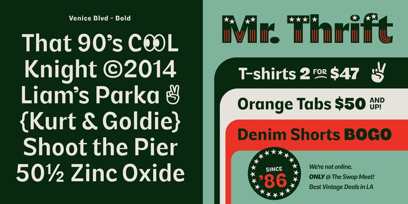 For those instances when you just need a bit of bounce, a bit of “je ne sais what now?”: may we introduce Venice Blvd. This display family is as eccentric as the drum circle at Venice Beach; as curvy as the Venice skate park bowls; as unpretentious as the souvenir stand selling pukka shell necklaces. Venice Blvd. comes in 4 weights with italics. Includes tons of emojis and symbols to spice things up.