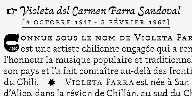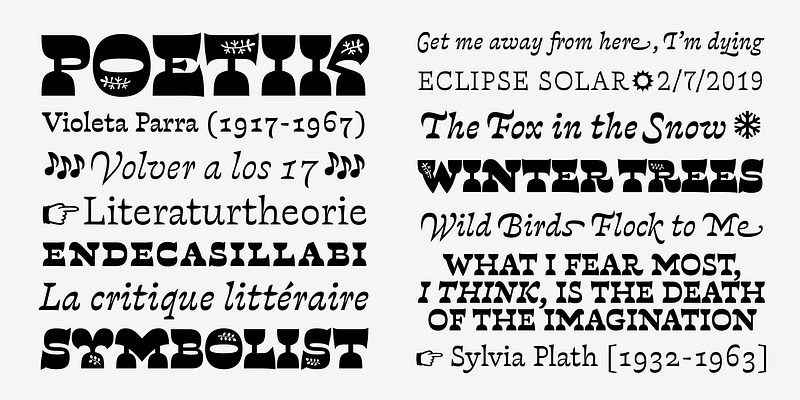 Violeta is a type family designed for text, its bold and particular look find precedents in Baroque and Expressionism. These typographic styles references helped us to develop an organic structure, which understands that the diversity of features and exuberant formal resources are viable ways to provide a balanced and comfortable texture for immersive reading. The main characteristic of Violeta is its stark reverse contrast. Violeta has decanted slowly, without anxiety, completely oblivious to the passing moments of fashion or trends of disposable design, which have gained so much space in our culture. Each glyph in Violeta has had time to mature until it has reached its own expression.