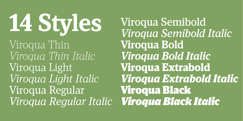 Viroqua is a redesign of Kandal (1994), one of my first typefaces, after 30 years more practice at type design. It’s a hybrid, combining old style details with modern proportions. It has fairly low contrast, with wedge-shaped slab serifs. Viroqua is very comfortable to read in text, and the boldest weights provide a lot of impact at display sizes. Viroqua features small caps, old style and lining figures (both proportional and tabular), superscript and subscript figures, fractions, and dingbats.