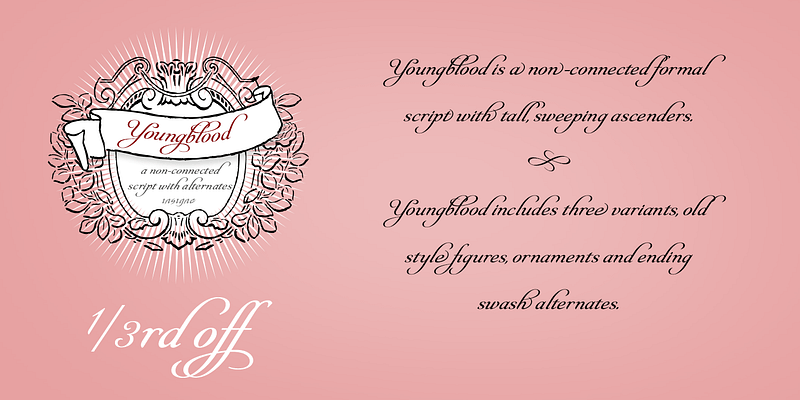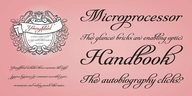 Youngblood is a non-connected formal script with tall, sweeping ascenders and alternates.