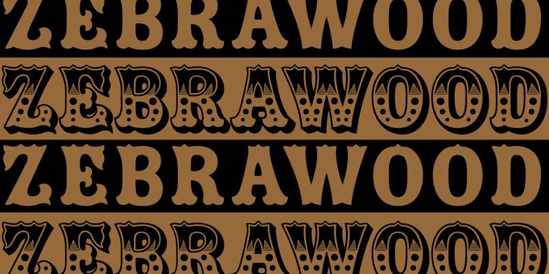 Of the many nineteenth-century wood type designs, the most popular seem to be variations of the Antique Tuscan style, which featured scalloped contours and upturned, pointed serifs. Designers of wood type found the Tuscan style to be ideal for embellishment, shading, and decoration. Adobe’s Zebrawood evolved from letters first seen in a specimen catalogue from the 1854 Wells and Webb Type Company. Zebrawood has a solid upper half, open lower half, graduated dots, and deep shadow; a style often used for circus posters and advertisements. Zebrawood, released in 1994, is a chromatic typeface (“chromatic” or multicolored typefaces were first created by carefully registering and overprinting two or sometimes three versions of each letter in different colors to produce a flamboyant appearance). Zebrawood has an alternate version of each letter which can be used for multiple color printing.
