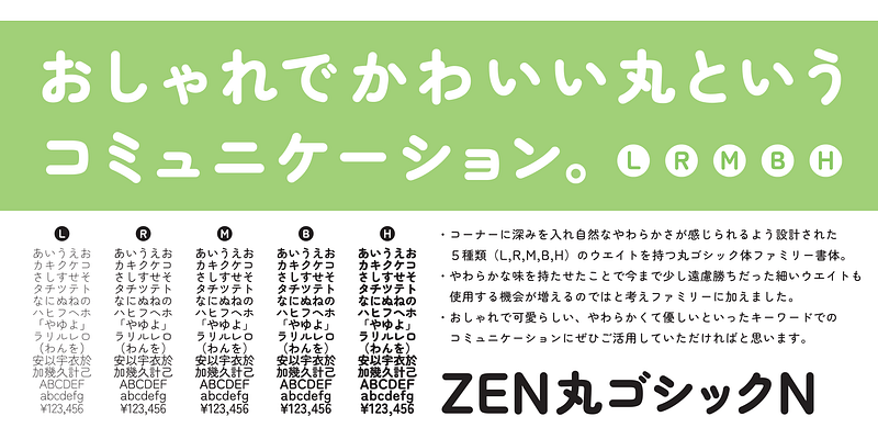 Zen Maru Gothic is a rounded sans-serif family that gives a soft and natural impression due to the deep rounds in the corners. Because of this unique soft impression the thin weight is also easy to use in any scenes. Cute and fashionable, soft and easy for any communications.